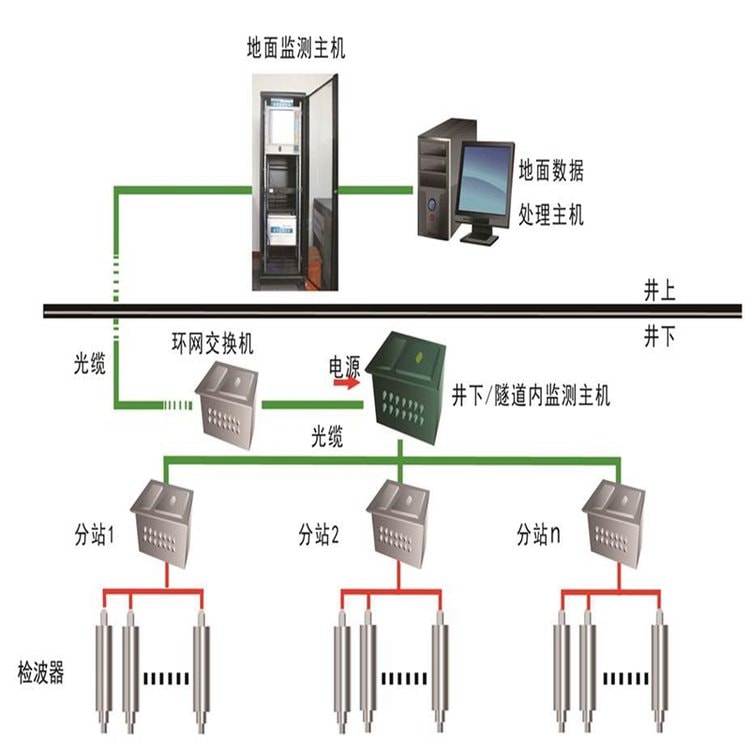 煤矿微震监测系统是一套分布式、在线微地震监测系统。通过网络级联起来的若干台采集分站将来自震动传感器的信号进行实时放大、滤波、模数转换,然后将数据通过工业以太网传送至中心站。每个采集分站可同时采集6通道的振动信号,可根据需要改变分站数量,从而实现系统扩容。分布式的格局使得震动传感器到采集分站的模拟信号电缆短,可将噪声、串扰、衰减等因素的影响降到低。信号采集分站之间采用先进的时间同步算法,使采集站的采样时序严格同步,限度地降低了地震波走时记录误差。中心站上的后台软件,对来自监测分站的实时震动波形进行滤波、识别、截取等处理,形成微震事件列表片段并由统一的数据库加以管理和向客户端推送。前台的客户端软件通过从数据库中获取的微震事件列表,自动进行事件的能量计算、坐标定位,并实时地更新“微震事件定位云图”和“微震事件报表”。