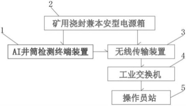 4.为了实现上述目的,本实用新型采用了如下技术方案:一种煤矿罐笼提升井筒ai智能隐患识别系统,包括ai井筒检测终端装置、矿用浇封兼本安型电源箱、无线传输装置、工业交换机和操作员站,所述ai井筒检测终端装置和无线传输装置的输入端与矿用浇封兼本安型电源箱的输出端电性连接,所述无线传输装置的输出端与工业交换机的输入端信号连接,所述工业交换机的输出端与操作员站的输入端信号连接。