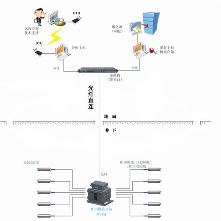 煤矿微震监测系统是一套分布式、在线微地震监测系统。通过网络级联起来的若干台采集分站将来自震动传感器的信号进行实时放大、滤波、模数转换,然后将数据通过工业以太网传送至中心站。每个采集分站可同时采集6通道的振动信号,可根据需要改变分站数量,从而实现系统扩容。分布式的格局使得震动传感器到采集分站的模拟信号电缆短,可将噪声、串扰、衰减等因素的影响降到低。信号采集分站之间采用先进的时间同步算法,使采集站的采样时序严格同步,限度地降低了地震波走时记录误差。中心站上的后台软件,对来自监测分站的实时震动波形进行滤波、识别、截取等处理,形成微震事件列表片段并由统一的数据库加以管理和向客户端推送。前台的客户端软件通过从数据库中获取的微震事件列表,自动进行事件的能量计算、坐标定位,并实时地更新“微震事件定位云图”和“微震事件报表”。