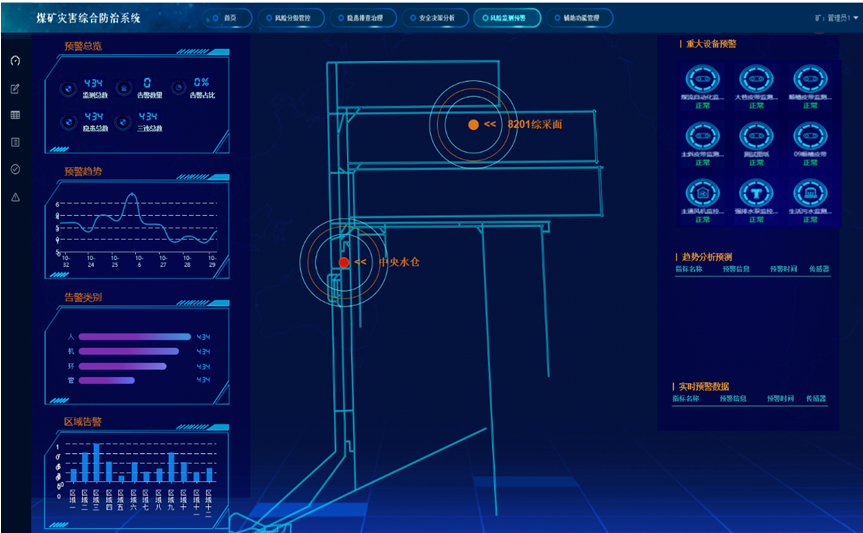 - **融合分析**:基于煤矿灾害监测和防控的多源异构信息的融合分析算法,建立煤矿综合灾害预警模型,对煤矿灾害进行有效综合预警。